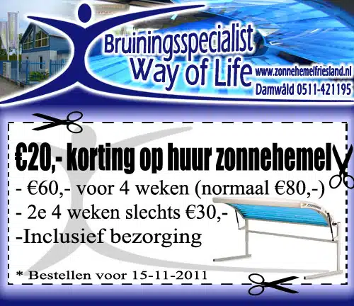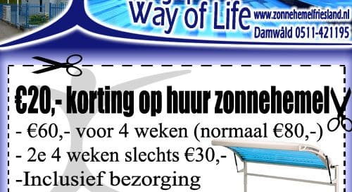 Huur nu een zonnehemel en ontvang direct ā¬20,- korting!! Normaal; ā¬80,- nu slechts ā¬60,- voor 4 weken. Verlenging opvolgende 4 weken slechts ā¬30,- [...]
