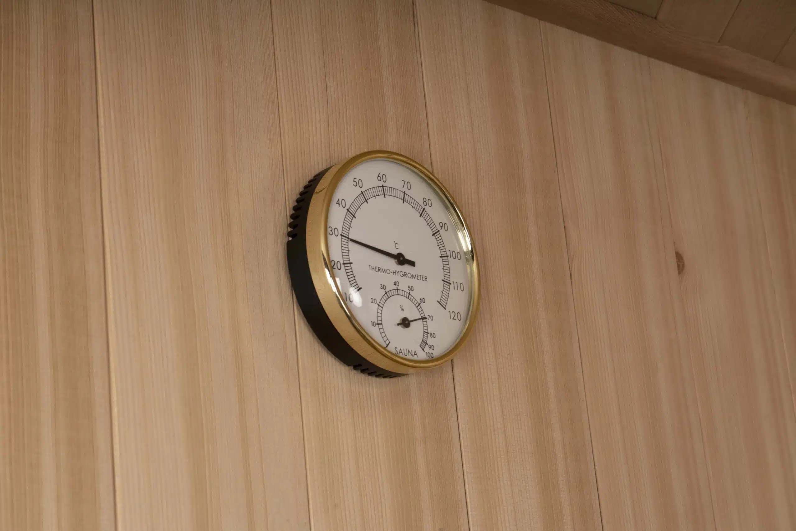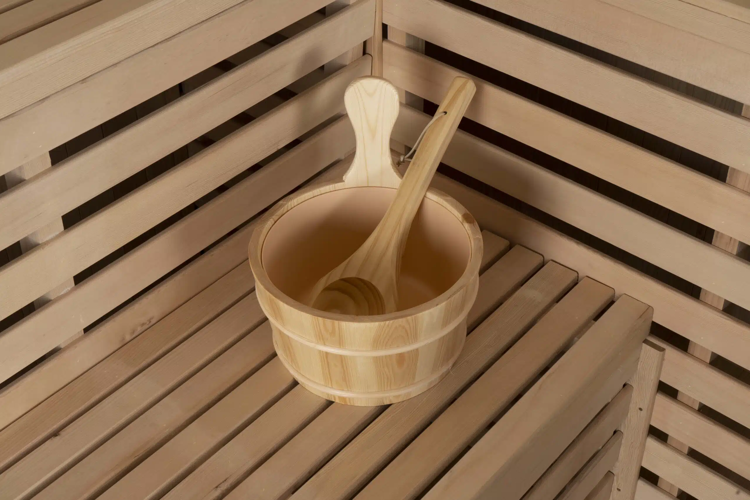 – het aanbod met volledige sauna accessoires (2 Sauna lichten, beker, pollepel, zandloper en thermometer)