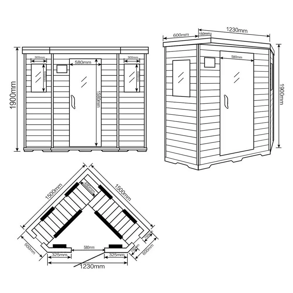 Daarnaast is deze wellnessoase is een uitzonderlijke eye-catcher en past door de afmetingen van 150 cm x 150 cm x 190 cm en in veel kamers, de kamers capaciteiten optimaal benut door de praktische hoekconstructie.Ā De ingangshoogte vanaf de grond is ca. 20 cm en de ingangsbreedte ca. 60 cm.Ā Vanwege het zuinige stroomverbruik van 2400 watt zijn de elektriciteitskosten voor een sauna sessie van een uur slechts ongeveer 72 cent, gemeten naar de gemiddelde elektriciteitsprijs.