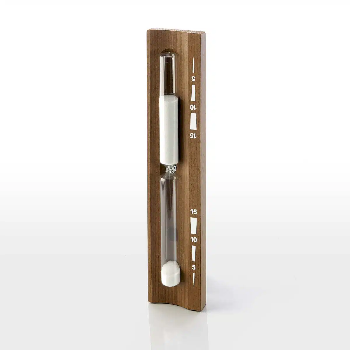 Mooie strakke zandloper van donker thermohout met wit zand.